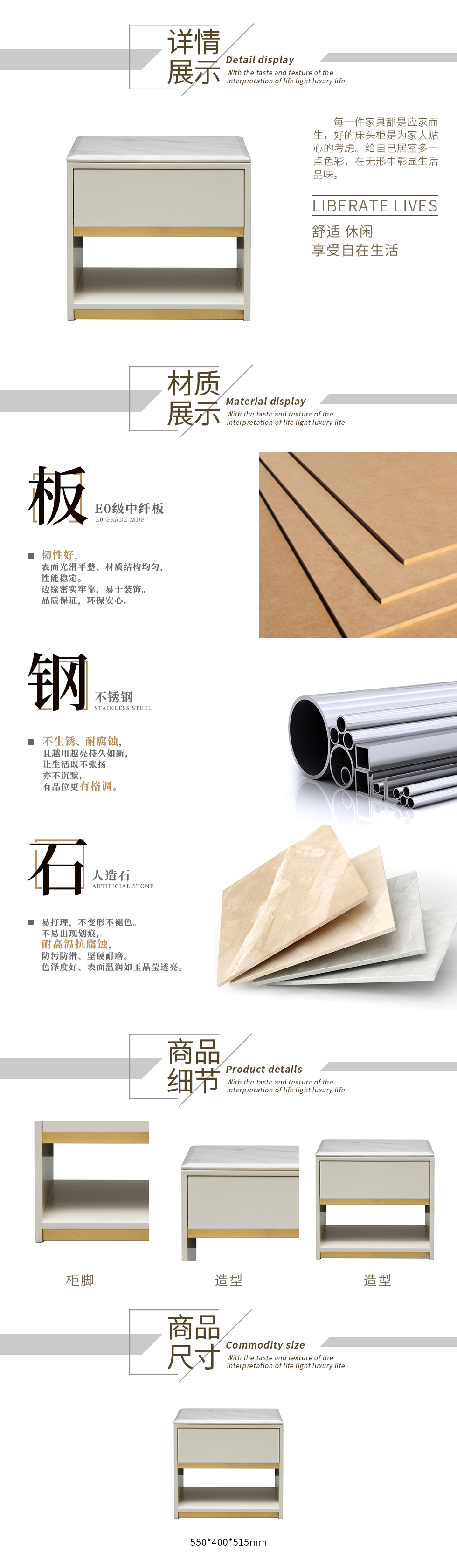 • 现代轻奢E0级中纤板+镀金拉丝+人造石面床头柜
