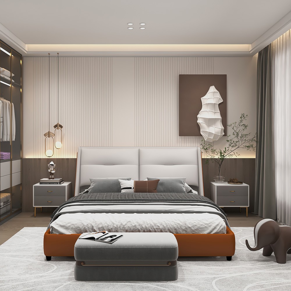 • 现代极简钢化玻璃+烟熏木皮+米白色哑光烤漆床头柜